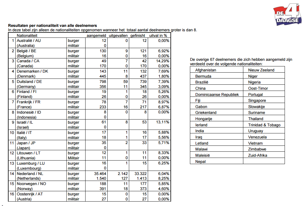 Het aantal verschillende nationaliteiten van alle deelnemers aan de 102de Vierdaagse is: 84 [2018]